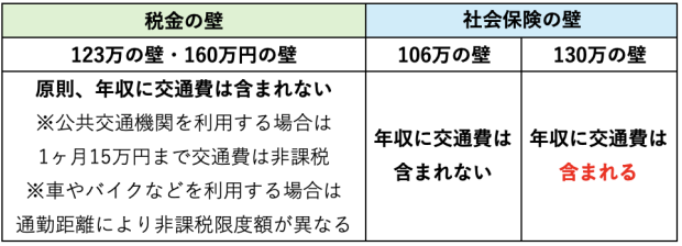通勤交通費の扱いは、年収の壁ごとに異なる