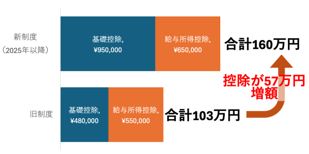 所得税の基礎控除が48万円から最大95万円に引き上げられ(年収約200万円以下の場合)、給与所得控除も65万円に引き上げられました。