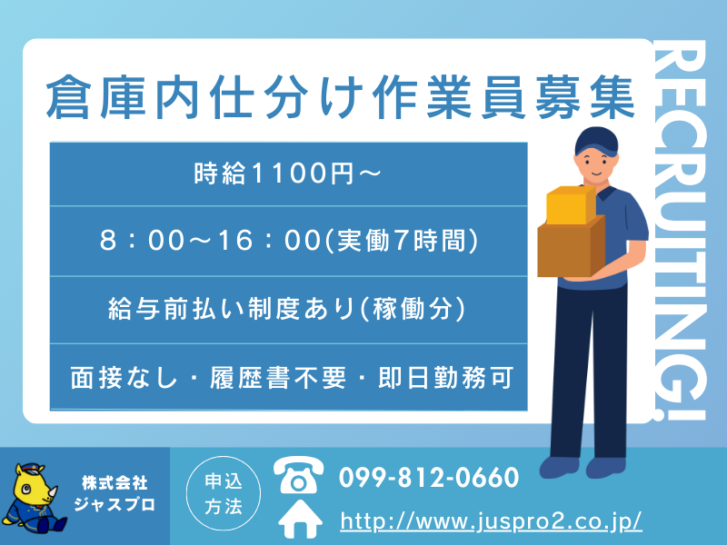 鹿児島県、倉庫内仕分け、シフト制の派遣社員求人情報