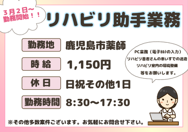 鹿児島県、医療・看護師・薬剤師、給料前払いOKの派遣社員求人情報