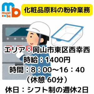 バイトTOParrow_bread_crumb岡山県arrow_bread_crumb組立・加工arrow_bread_crumb残業なしのアルバイト・バイト・求人