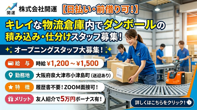 バイトTOParrow_bread_crumb大阪府arrow_bread_crumb泉大津市arrow_bread_crumb倉庫・物流管理arrow_bread_crumb週払いOKのアルバイト・バイト・求人