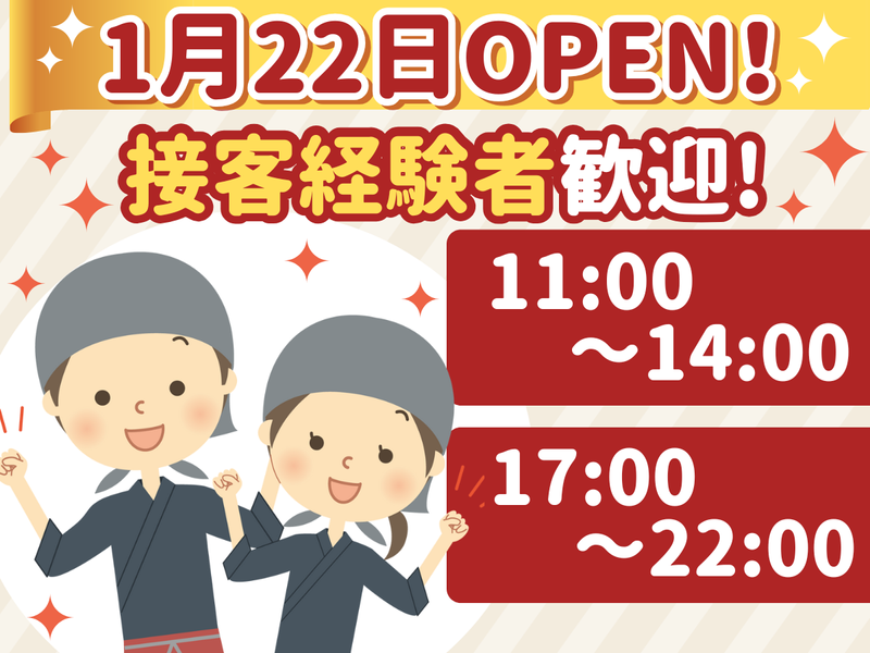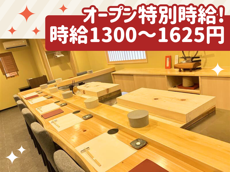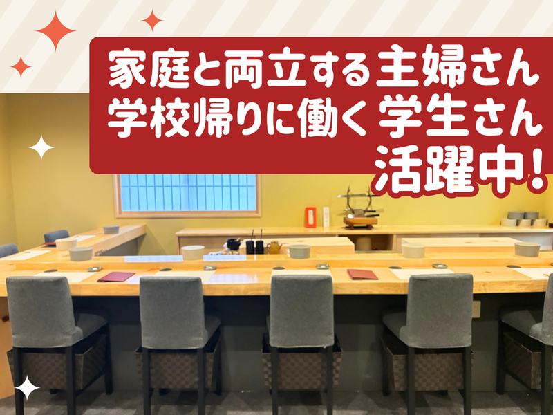 仕事内容 \ 接客・飲食経験者大歓迎! / ▶▶ 1月22日にNEWオープン! ◀◀ 年明けから新しい働き方したい人必見! ✨ 1月22日~3月末まで✨ ✨ オープン特別時給 ✨ ✨ 1300円~1625円 ✨ ⭐週1日~OK! ⭐通常時給1200円~1440円 ⭐昇給あり!頑張りを評価! ――――――――――――――――――― ■ 仕事内容 ――――――――――――――――――― 寿司屋でのホール業務全般と調理補助を お任せします! ◎具体的には… ・オーダー取り ・ドリンク作成 ・調理補助 ・清掃作業 など まずはメニューを覚えるところから! 初めてのお仕事にチャレンジする 不安な気持ちも理解しています◎ 安心してお仕事がスタートできるように 先輩がしっかりとサポートしますね♪ ⏩勤務時間 11:00~14:00/17:00~22:00 ※ランチ営業は火・木・土曜のみ \こんな方にピッタリのお仕事です!/ ✅ 接客や飲食の経験がある方 ✅ 人と話すことが好きな方 ✅ 短時間で働きたい方 【 活躍中のスタッフの声 】 ◎11:00~14:00帯で働く主婦さん  ̄ ̄ ̄ ̄ ̄ ̄ ̄ ̄ ̄ ̄ ̄ ̄ ̄ ̄ ̄ ̄ 短時間勤務なので、子どものお迎えまでの 時間を有効に使って働けています。 家事の合間に無理なく入れるのが 嬉しいポイントです♪ 常連のお客さまと会話を楽しめるので、 接客が好きな方にはやりがいがあります。 忙しい時も、周りが自然に 声をかけてくれるので、 安心して続けられています。 ◎17:00~22:00帯で働く学生さん  ̄ ̄ ̄ ̄ ̄ ̄ ̄ ̄ ̄ ̄ ̄ ̄ ̄ ̄ ̄ ̄ 学校帰りにそのまま働けるので、 生活リズムを崩さずに続けられています。 接客の中でお客さまと話す機会が多く、 人と関わるのが好きな自分には ぴったりの環境です。 ピーク時は忙しいですが、 スタッフ同士でフォローし合えるので、 達成感を感じながら働けています。