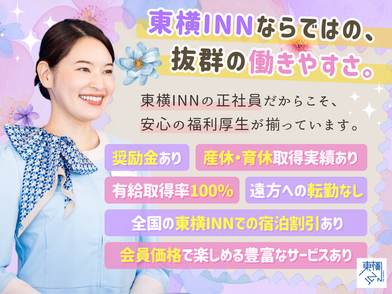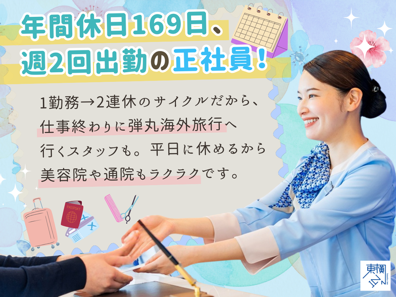 仕事内容 滞在されるお客様へ、 ホームに帰ってきたような 安心感をお届けしたい。 そう考えて私たちが 新しく作り出したポジション、 それが【ホテリエ】です。 東横INNが目指しているのは、 お客さまにとってホテルが 「第2の我が家」になること。 そのためにホテリエは、 お出迎えからお見送りまで担当します。 誰でもいいスタッフの一人ではなく、 「あなた」を頼っていただく。 信頼感が居心地の良さにつながり、 何度でも帰ってきたくなる場所になる。 この取り組みにより、自然と リピーターのお客様も増えています。 「お客様に向き合いたい」 「お客様に好かれるホテルで働きたい」 その思いを【ホテリエ】で 形にしてみませんか? ■仕事内容■ ✅チェックイン・チェックアウトを 中心としたお客様対応 ✅電話応対(予約など) ✅売上の簡単な集計作業 ✅ロビー・カウンター周りの清掃 ✅宅配便の手配 など ✨週2回出勤が基本スタイル✨  ̄ ̄ ̄ ̄ ̄ ̄ ̄ ̄ ̄ ̄ ̄ ̄ ̄ ̄ チェックイン~アウトの間を通しで ご対応するため、1回の勤務は25時間 (10:30~翌11:30)となっています。 長く感じるかもしれませんが、 1回働くごとに【2連休】がセット。 なので出勤は週に2回ほど。 2日働いて、2日休むサイクルで、 年間休日は169日あります。 しっかり休み、心に余裕をもって お客さまを迎えてもらえるように 整えた働き方です。 ・平日に映画やカフェ巡り ・趣味や推し活に思いきり時間を使う ・有給使用して、ふらっと旅行へ など、時間の使い方はあなた次第。 空港の近くなので、退勤後そのまま 空の旅へ…なんてスタッフもいますよ。 ✨支え合いが、ホテリエの日常✨  ̄ ̄ ̄ ̄ ̄ ̄ ̄ ̄ ̄ ̄ ̄ ̄ ̄ ̄ ̄ ̄ ホテリエはチームでの連携を前提に 動いています。 周りと支えあい、余裕をもって 取り組む姿勢も、お客様の安心感に つながっているからです。 スタッフ一人ひとりが、充実の休日で 自由を満喫しているため ピリピリした雰囲気はありません。 自然な笑顔で協力し合える気持ちよさも ホテリエの魅力の一つなんです。 ✨未経験でも安心スタート!✨  ̄ ̄ ̄ ̄ ̄ ̄ ̄ ̄ ̄ ̄ ̄ ̄ ̄ ̄ ̄ ̄ ̄ ホテル勤務が初めてでも大丈夫。 入社後は、接客の基本から 研修でしっかり学べます。 現場に立つようになってからも、 毎日複数名体制での勤務なので、 すぐに先輩に聞ける環境です。 久しぶりのお仕事復帰の方も、 少しずつ慣れていってくださいね。 また、できるようになったこと、 任せられるようになったことを 等級制度で見える形にし、 ステップアップを明確に評価します。 次にやってみたいこと、 目指したい姿も自然とイメージでき、 モチベーションにつながる仕組みです。 =============== 「ホテリエ」の働き方が 少しはイメージできたでしょうか? あなたのやりたい事と重なれば とても嬉しく思います。 まずは話を聞くだけでも、 お気軽にご応募ください◎