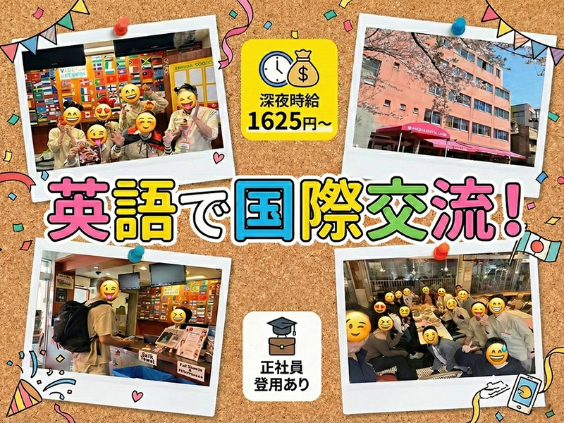 仕事内容 ──────────────────── まるで海外にいるような環境! サクラホステル浅草で、 世界中からのゲストをお迎えしませんか? ──────────────────── 「ワーホリ後の英語力を維持したい」 「将来は自分のゲストハウスを持ちたい」 そんな夢を持つ仲間が集まる 最高にエキサイティングな職場です! 【業務】 世界中のバックパッカーや旅行者が集まる「サクラホステル浅草」での店舗運営全般をお任せします。 お客様との距離が近く、マニュアル通りの接客よりも「あなたらしいおもてなし」が喜ばれる環境です! 具体的には?・・・ ・チェックイン・アウト、コンシェルジュ対応: 英語での案内がメインです。 ・カフェ業務: 朝食の提供や、24時間対応カフェでの接客。 ・ドライエリア清掃:お客様には常に快適な環境を提供しています。 【ここがポイント!】 ・英語が公用語!?: 国際色豊かな環境です。日本にいながら留学気分を味わえます。 ・将来の起業を応援: オーナー自身も夢を叶えた一人。経営ノウハウや計数管理も学べます。 ・仲間との絆: 20代から50代まで年齢層も様々! 世界の母国料理クッキングイベントなど、スタッフ同士の仲の良さはSNSをチェック!