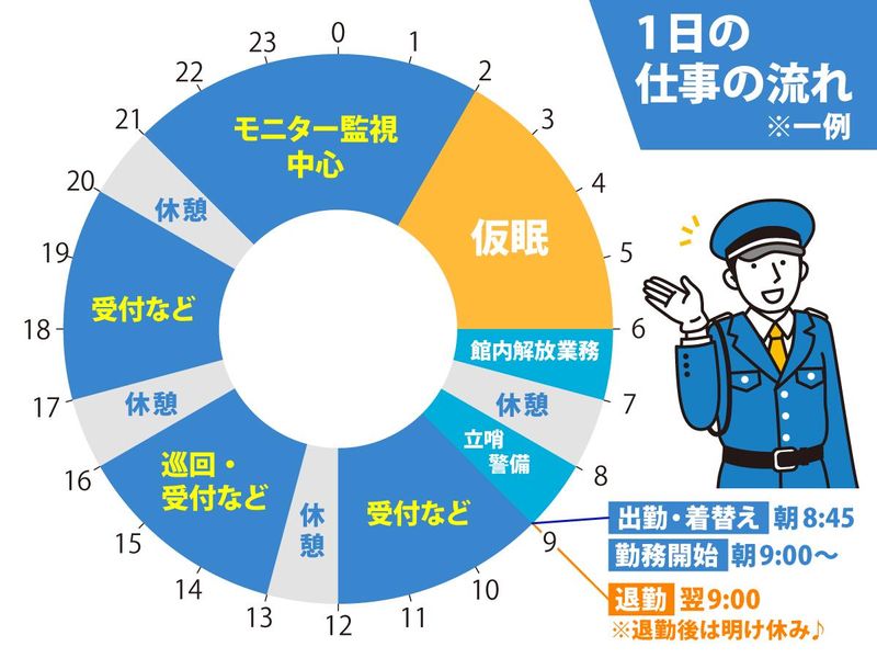 勤務時間詳細 総労働時間:1ヶ月あたり172時間 勤務時間は09:00~翌09:00(場所により10:00~翌10:00)の24時間勤務(休憩時間の8時間を含む。) シフトは3日に1回の勤務が基本