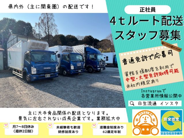 仕事内容 店舗納品はカゴ台車中心でスムーズ。 11時 or 13時でスタート時間が選べるルート配送です。 残業代100%支給・平均月収34万円以上の安定収入。 \普通免許からもスタート可能/ 資格支援制度(規定あり)を利用し、働きながら中型・大型免許を取得できます。 教習所に行っている期間中も給与発生しますので安心! 【研修制度】 研修専門のスタッフが(運転・座学)を独り立ちできるまでしっかりフォロー。 未経験の方も約3ヶ月程度でドライバーを目指せるシステムです。 免許取得まで座学や荷扱いなど行い、免許取得後から運転の知識を研修します。 \お気軽にお電話も歓迎!/ TEL/048-792-0235(正社員ドライバー採用係) 【職種】 〇ルート配送ドライバー ▼ルートドライバーの注目ポイント▼ 〇長時間運転なし 〇月額302,780円~各種手当あり 〇平均月収346,544円(在籍340名) 〇残業代は別途全額支給 〇月7~8日はしっかりお休み 〇不況にも負けない安定した仕事量 〇複数の資格支援制度有→例)中型免許へのステップアップなど 〇働きやすい職場認証制度取得 〇30代・40代・50代活躍中! ///////////////////////////////////////////////////////////////// 【仕事内容】 4tトラックを運転して路面店などに日用品・食品を配達するお仕事です。 埼玉県内と埼玉県周辺エリアが中心。 固定ルートのため、一度覚えればルーティンワークとして働けます。 ・1日の配送件数:10店舗程度 ・カゴ台車使用/検品なし 店舗納品はカゴ台車中心。 積み込み時に一部手積み作業はありますが、 置き配のため納品作業はシンプルです。 重い荷物を長時間持ち続ける作業や、店舗ごとの検品・仕分け作業はありません。 〇1日の流れ (1)営業所・物流センターで積み込み (2)2~3店舗へ配送 (3)センターに戻り再積み込み (4)1日2~4往復程度 【独り立ち後】 はじめは2~3便を担当して、スキルに合わせてコースを増やすなどステップアップ可能です。 独り立ち後も会社でバックアップしていきます。 未経験の方は極力日勤帯のお時間をご案内しております。 【採用ホームページはこちら】 日生流通運輸倉庫株式会社 https://entori.jp/nissei-ryutsu-seishain