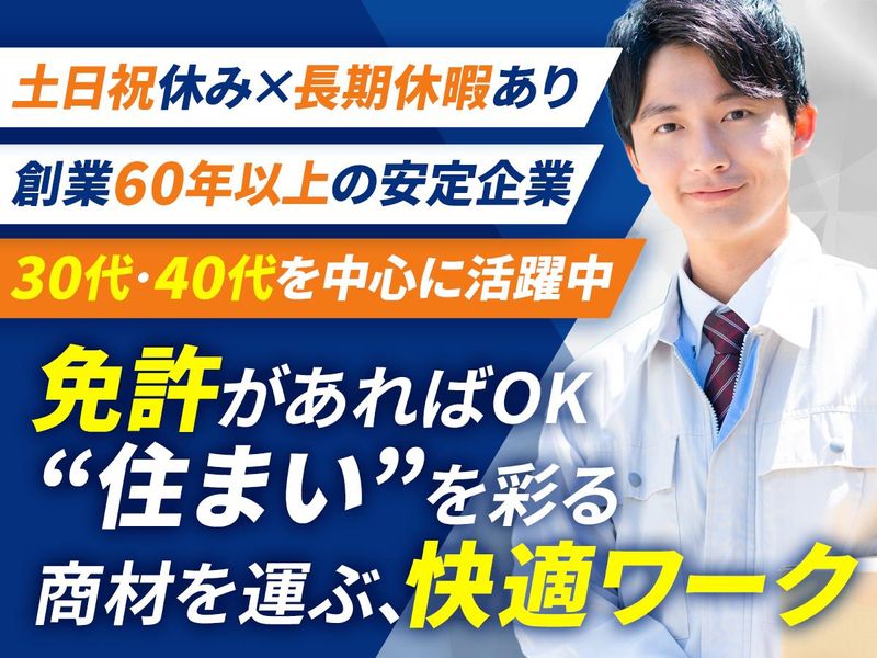 仕事内容 \\*始めやすさがポイント*// ★未経験歓迎!普通免許があればOK ★完全週休2日制/土日祝休み ★働き方も収入も、安定性バッチリ◎ ★マイカー通勤OK!無料駐車場あり * * * 【業務内容】 壁材・床材・カーテンなどのインテリア商材を お客様や現場に配達・納品するお仕事です。 <取引先> インテリアショップやカーテンショップ 内装工事店 …など <取り扱う商材> 新築・リフォームで使われる壁材や床材、 カーテン、カーペット …など 一流メーカーとのコラボ商材など アイテム数が豊富にあるため、 お客様からの様々なニーズに対応できます。 <仕事の進め方> 配送のルートや指示などは、 正社員の配送と協力して行います。 いずれも先輩スタッフが丁寧に指導するので、 すぐに覚えて活躍できます! 【入社後のサポート】 お仕事に必要なことは、 入社後にイチから丁寧にお教えします。 ・業界知識 ・商品知識 ・お客様とのやり取り方法 …など 皆さんがスムーズに働けるように、 先輩スタッフがしっかりレクチャーします! - ◆『池田ハルク』について - 1960年の創業以来、 「インテリア専門商社」として成長を続けています。 現在は本社を含め18拠点を展開。 安定した業績を背景に、これからもお客様に 信頼される企業を目指して歩み続けています。