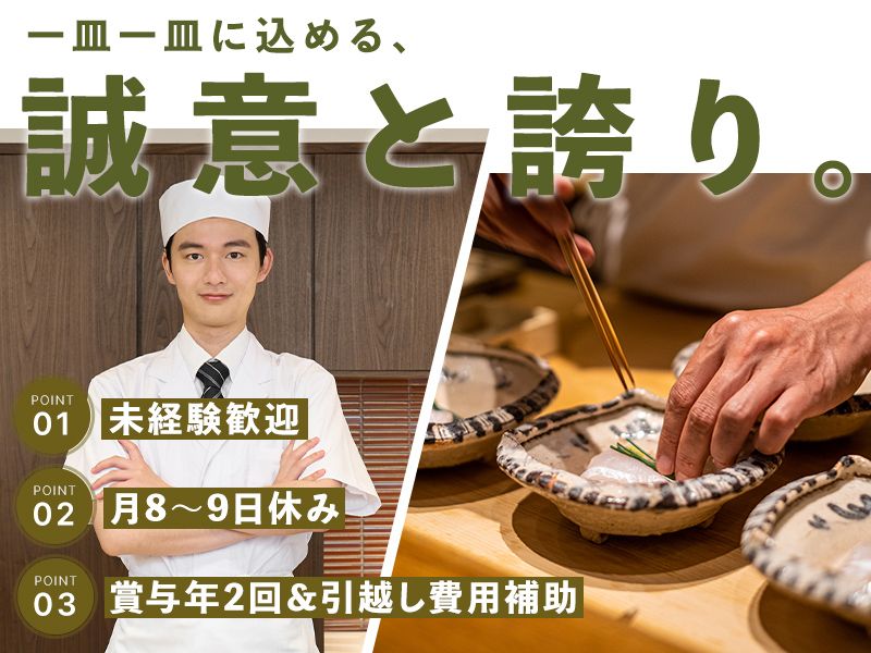 仕事内容 x=x=x=x=x=x=x=x=x=x=x=x=x=x \未経験からの挑戦も大歓迎!/ 一皿に込める、矜持と誇り。 【調理スタッフ】募集中〇 x=x=x=x=x=x=x=x=x=x=x=x=x=x 《当店のご紹介》 日本料理店である当店。 ランチ時には主婦層のお客様、 そして夜には接待などでお越しいただく シーンも多いです。 【仕事内容】 当店の調理スタッフとして調理全般を お任せしていきます。 〇仕込み 〇調理・盛り付け など 飲食未経験の方もご安心ください✨ 入社後にはオリエンテーションを実施。 さらに実務研修は基本マンツーマンで、 丁寧に指導していきますので、 基礎からスキルを身につけることが できる環境です。 \この求人のポイント!!/ ✅「ゼロから手に職を」つけられる! ✅月8~9日休み!プライベートも充実♪ ✅賞与年2回!さらに家族手当もアリ! ✅入社に伴う引越費用は最大10万円補助 ✅資格取得を会社でサポート! (唎酒師、和食検定、フグ調理師など)