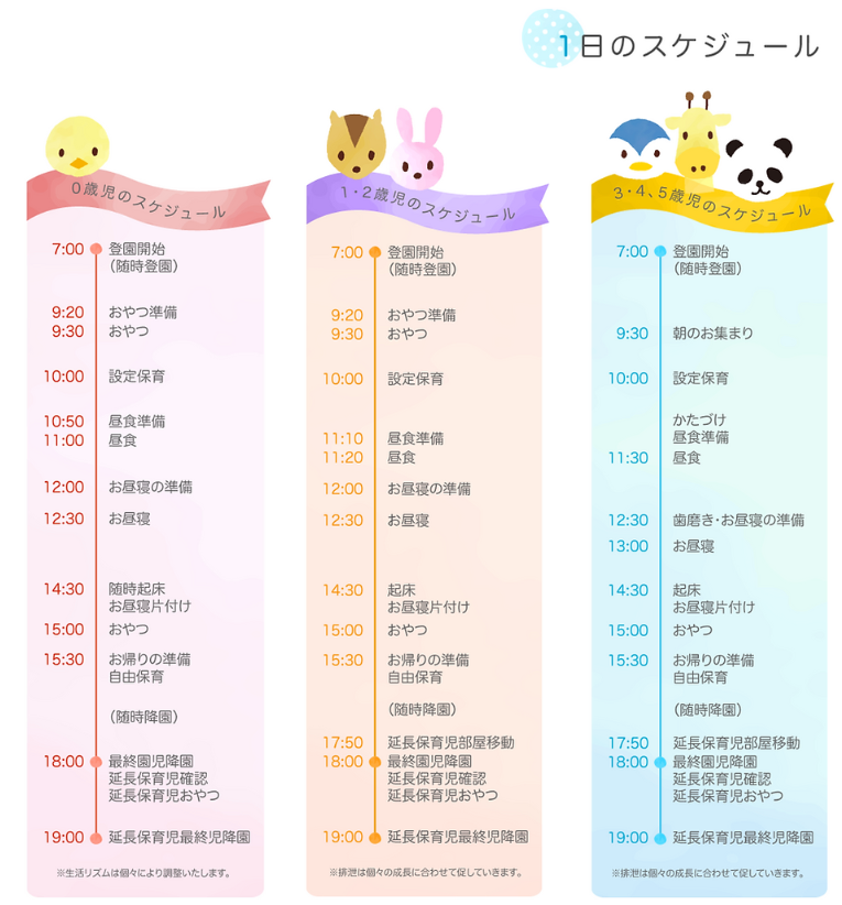 仕事内容 ・・・・・・・・・・・・・・・・・ ✨きりしまサニーサイド保育園✨ 経験はなくても「子供が好き」の 気持ちがあれば、年齢問わず大歓迎♪ ・・・・・・・・・・・・・・・・・ <具体的なお仕事内容> 小規模認可保育園「きりしまサニーサイド保育園」です。 定員19名の小規模認可保育園です。 0歳~2歳までのこども達一人一人に寄り添いながら 日々楽しく保育していただきます。 入社時期につきましては相談可能です! パート職員には8:00~16:00の間の勤務可能時間でお仕事をお願いいたします。 パート早番専従者には2時間だけ開園準備、こどもの受け取り業務をお願いします。 <1日の流れ> 7:30~ 当園開始(開園準備) 9:30~ おやつ/朝のお集り 10:00~ 設定保育 11:00頃 昼食→12:30頃 お昼寝 15:00~ おやつ 15:30~ 随時降園 18:30 延長保育最終園児降園 ✅どんな方も、大歓迎です! 〇新卒 〇第二新卒 〇扶養内勤務希望 〇60歳以上の方 〇ブランクがある方 〇実務経験が全くない方 〇年齢不問 ✅自由度の高い職場環境♪ ・髪色やネイルは自由です! 厳しい規定がないので、 おしゃれも楽しみながら、 「あなたらしく」働けます! ✅働きやすく、休みやすい! ・年末年始、日祝日は完全休みで プライベートも充実できます♪ ・持ち帰り仕事や残業はなく、 遅番の場合も18:30までの勤務なので 家事や育児とも両立しやすい環境です。 ・パートで働きたい方や、 日勤フルタイムで働きたい方など 就労時間は相談に応じ、柔軟に対応! 扶養内での勤務希望の方も歓迎です◎ *現時点では18:00までにはこども達の降園が完了しますので、 遅番はシフトはありません。