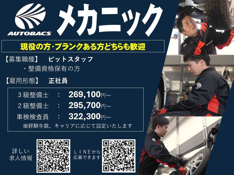 仕事内容 【東室蘭店】業務拡大|資格・経験を活かしてキャリアアップ|カーメカニック|正社員|充実待遇|転職応援 ●充実待遇・長期休暇あり! ●資格取得も支援!長く安定したキャリア設計が可能! ●働きやすい職場で長く安定した将来設計も! ●充実の研修制度でお仕事スタートも安心! ●社員割引でカー用品もお得! カー用品専門店のピットコーナーで自動車整備や接客のお仕事をお任せします。 ・点検整備:タイヤ、オイル、バッテリーなど消耗品パーツのチェック ・緊急整備:事故、故障、破損など、緊急対応が必要な修理、整備 ・分解整備:故障による整備の中でも、車体にとって重要な機械部分の分解、整備 ・板金、塗装:車体についたキズやヘコミの補修、塗装作業 ・取付作業:ドライブレコーダーなどカー用品の取付作業 ・お客様対応:故障や破損など修理箇所のヒアリング、車検や定期点検についての説明 ※ お持ちの資格により業務内容が異なります。 お持ちの資格や技術、知識により、お任せするお仕事の範囲を調整するので、経験に不安がある方もお気軽にご応募下さい。 入社後、機器の使い方や作業の流れなどイチからしっかりレクチャーするので安心してお仕事スタートができます! 充実の育成プログラムで「クルマが好き、興味がある」という方から「一流のメカニックを目指したい」という方まで、一人ひとりに寄り添った体制を用意! 国内外のさまざまな車種に触れることができるため、楽しみながら成長を実感できる環境です。 アピールポイント 資格や経験を活かして活躍! 自動車整備士の資格をお持ちの方、自動車整備のお仕事経験がある方、ぜひご応募ください! 現在、メカニックスタッフを積極採用中です。 カーディーラーやガソリンスタンドなどで培った技術が活かせます! ピット作業は5~10人体制で行うため、分からないことも気軽に相談しやすい職場です。 ブランクや経験に不安がある方も万全のフォロー体制でお迎えします。 キャリアアップを目指すあなたを応援 技術と経験を磨き、上位資格を目指す方の資格取得もサポートします! 受験費用の支援に加え、合格後には資格手当も用意! 働きながら着実に成長できる環境を用意しています。 長く安定して働ける職場 20代・30代・40代とライフステージの変化にあわせて働きやすい職場づくりを目指しています。 年間休日100日以上・リフレッシュ休暇の導入など休暇制度も充実しているため、プライベートやご家族との時間を大切にできる環境です。 ___________________________________ 【LINEでの応募はこちらから!】 ※ 友達追加で「応募」となります。 ※ トークルームで求人の「店舗・職種・雇用形態」情報の送信をお願いします。 ※ お問合せもLINEからご連絡をお願いします。 採用LINE IDはこちら→ @589hkwr