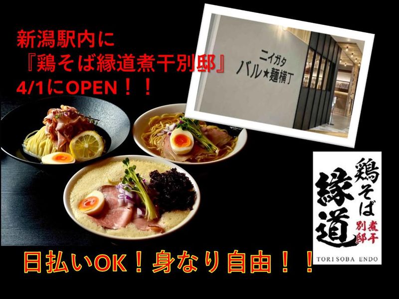 仕事内容 新潟駅内の ニイガタ バル☆麺横丁に 「鶏そば縁道」の 煮干しらーめん専門店が 2025年4月1日OPEN! ホールスタッフ募集です! 簡単な料理補助、オーダー、 配膳、片付け、 簡単な洗い物などシンプルな お仕事ばかりです! まずは元気な挨拶が できれば問題なし! 最初は先輩の後ろについて、 徐々に流れを覚えていって下さい。 また慣れてきたら盛り付け等の 調理補助もお願いします。 髪色、髪型、ピアス、ネイル、 タトゥーなど身なり自由です! おいしいまかないもあるので パート終わりに 食べて帰れちゃいます♪ 日払いも可能です! 「今週ピンチ!」の時もご相談ください! 弊社スタッフの平均年齢は 20代後半と若い職場です! もちろん40代・50代の ミドル層も活躍していますよ♪ 60歳以上のシニア世代も応援しています! もちろん、 小さいお子様がいる方も働いており プライベートに合わせて働ける環境です♪ ⭐▶ おすすめポイント  ̄ ̄ ̄ ̄ ̄ ̄ ̄ ̄ ̄ ̄ ̄ ̄ ̄ ̄ ̄ ✅週2日~1日4時間~の勤務でもOK! アナタの勤務希望を教えてください♪ ✅平日のみ、土日のみなど選べる! WワークOK!曜日固定もご相談ください ✅飲食店未経験大歓迎! バイトデビュー歓迎! 楽しく働ける環境をご用意しております ✅日払い導入しているらーめん屋です! 自分の都合に合わせやすい! 知識、経験不要です。  ̄ ̄ ̄ ̄ ̄ ̄ ̄ ̄ ̄ ̄ ̄ ̄ ̄ ̄ ̄