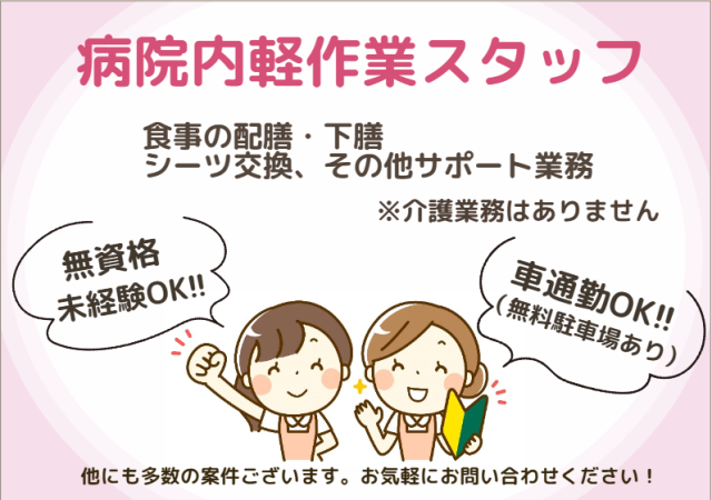 募集要項 職種 軽作業スタッフ/清掃・消耗品補充・簡単業務 雇用形態 派遣社員 仕事内容 病院内でのシーツ交換、 物品の補充、患者様の誘導、配膳・下膳、 その他サポート業務お願いします。 ※身体介護は行いませんのでご安心ください。