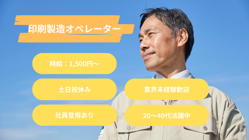 仕事内容 シルクスクリーン印刷製造の工場でのお仕事です。 印刷・製版・抜き加工・検査などの業務があります。 また製造オペレーターなど専門的な業務へのキャリアアップも見込める職場です。 未経験でも大丈夫◎幅広い年齢層の方がスタートしてます。 【おススメポイント】 ・難しい知識は必要なく、未経験でもスタートできます。 ・幅広い年齢層(20~60歳位まで)の方が勤務しています。 ・工場での勤務経験を活かせるお仕事です! ・ブランクがある方もOK! 長期で働ける職場で未経験~中高年の方も多数活躍しています。 安定して働きたい方にピッタリ! 詳しい職場情報については担当よりご案内いたします。 まずはお気軽にご応募・ご登録お待ちしております。