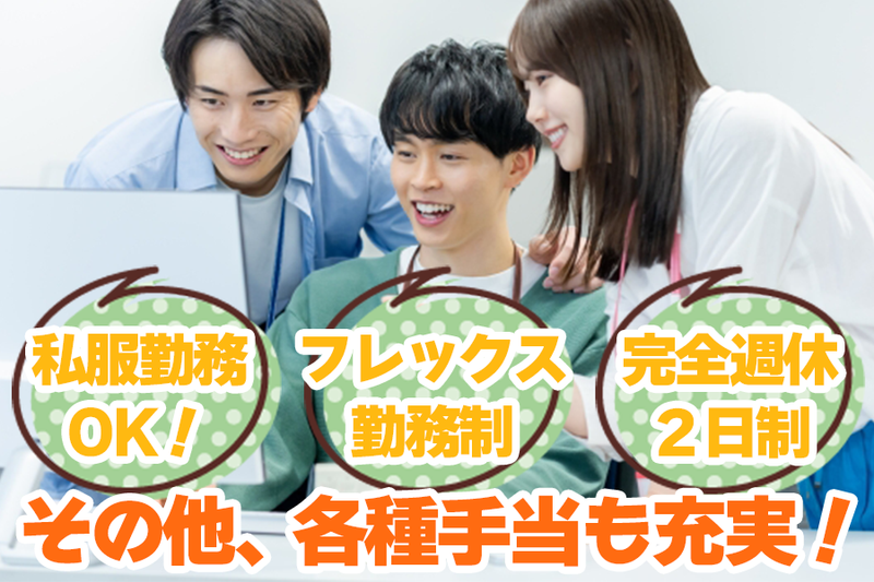 勤務時間詳細 総労働時間:1ヶ月あたり160時間 8:30~17:30 フレックス制度(コアタイム10時~15時)