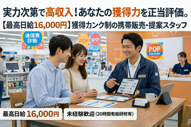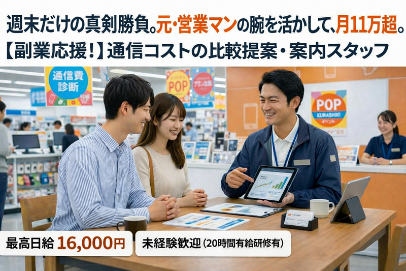 仕事内容: 一人暮らし、将来への不安。でも今の会社は辞められない。それなら、週末の「時間」を「資産」に変えませんか?岡山・倉敷エリア最高水準の報酬が、あなたの生活を支えます。稼げる理由は徹底した20時間の有給研修があるからです。元営業職の方なら、お客様とのコミュニケーションのコツさえ掴めば、すぐに高ランク(高日給)に到達できます。 【具体例:1日の流れ】 09:30:現場集合 10:00:イベント開始。抽選会を通じたきっかけ作り。お客様の通信費シミュレーション。メリット・デメリットを比較提示。 12:00:お昼の一時間休憩 13:00午後の仕事開始。あなたのスキルでお客様あの「意思決定」をサポート。 18:00:当日の成約案件を全てスタッフへ引き継ぎ、業務終了。 【主な業務内容】 ・家電量販店を中心とした販売促進イベントでの大手キャリアの通信サービス(携帯・光回線)の診断・提案 ・お客様の利用状況に合わせたシミュレーション作成 ・クライアントへの商談内容引き継ぎ 「稼ぐこと」が好き。その気持ちに素直になって、新しいチャレンジを始めましょう。