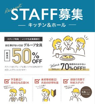 仕事内容 「料理に興味がある」その気持ちがあればOK!大切なのはスキルよりも【やる気】☆ 簡単な仕込みと調理(サラダや一品料理)、能力次第で本格的なパスタやリゾット、手作りの窯焼きナポリピッツァ作りをお願いします。「お料理を覚えたい!」という方にピッタリ☆未経験の方でも調理器具の使い方からしっかりお教えしますよ♪ 「バイトで出会った仲間は一生の友達!」そう思える仲間に出会えます☆ 現在、子育て中の主婦(夫)の方、学生さん、フリーターの方まで幅広くたくさんの方が働いています。もちろん、未経験からスタートした方も今ではしっかり一人前に活躍中☆スタッフの趣味も様々で、「料理に興味がある」「ゲームや漫画が趣味」「アウトドアが趣味」「オシャレが好き」など個性豊か☆きっと気の合う仲間が見つかりますよ! プライベートのちょっとした“スキマ時間”で賢く稼げます!例えばこんな働き方はどうですか? ≪在籍中スタッフの働き方をご紹介☆≫ ◆高校生Aさん…平日「17時~22時」、土日「9時~16時」 ◆主婦Bさん…平日「9時~15時」、土日はお休み ◆フリーターCさん…平日&土日「9時~18時」or「16時~24時」 勤務時間・曜日はご相談に応じます!無理のない働き方を一緒に考えましょう! 職場の雰囲気が良くてうれしいメリットもある!長く続けられる理由がたくさん◎ 未経験スタートの方が多いから、新人さんの教育はお任せください!マニュアル完備&社員さんがマンツーマンで1人前になるまでしっかり研修を行います☆また、勤務時は70%OFF、お仕事のない日はグループ全員分50%OFFの従業員割引も大好評!他店舗合同でフットサルやBBQなどレクレーションもあります!誕生日にはプレゼントも!? 『PISOLA(ピソラ)』非日常の空間でこだわりの本格イタリアンをお楽しみください。 リゾートホテルのダイニングをイメージした店内は、色鮮やかな植物や水のせせらぎ、さわやかなBGMに気のきいたサービスがあふれる癒しの空間。ただご飯を食べるだけではなく、忙しい日常を忘れ、誰もが笑顔になり幸せを感じられる。PISOLAはそんな場所であり続けたいと考えます。