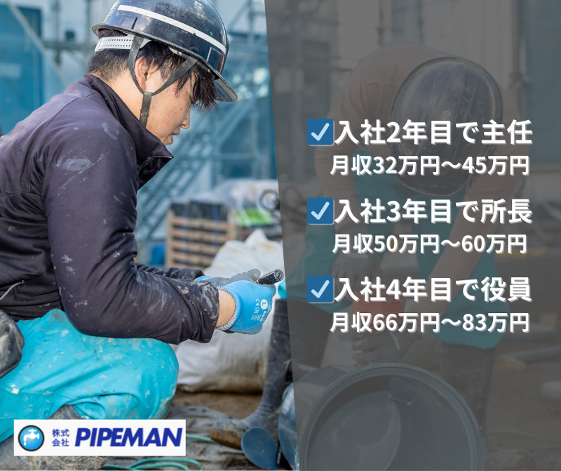 仕事内容 *株式会社 PIPEMAN(パイプマン)* *日本で一番成長スピードの早い設備屋です* *100名以上スタッフのいる会社なので安心!* *取引先は9割以上が上場メーカーなので安定!* ※毎年昇進可能(5万円〜20万円/月) ※スキル重視の評価制度社歴や 年齢を問いません! *\稼げる理由はココにあり/* *なぜPIPEMAN(パイプマン)は稼げるのか?* *【理由①】作業効率が良い!* メーカーごとの設備・配管の 特徴などをマニュアル化 メーカー直請けなので売上が20%高い! *【理由②】一人前になるスピードが早い!* 分譲住宅を専門としており、 覚えることが少ない! *【理由③】昇格スピード* 全国拡大により役職の枠が多いため 昇格スピードが早い環境です。 ****仕事内容**** 新築住宅やアパートの水廻りにおける 配管工業務・水道工事に関わる仕事全般。 *《主な業務内容》* 新築住宅内のトイレ・キッチン・お風呂などの 給水・排水設備の取付や配管を行います。 *《すぐにでも働けます!》* ご希望の方はすぐにでも入社が可能! 遠方から社宅に入寮した場合、 敷金・礼金一部保証で安心! *《職場環境》* チームで連携して仕事をしているので、 コミュニケーションが自然と取りやすく、 和気あいあいと楽しい雰囲気の職場です! これから仲間になる皆さんが、 ストレスなく働ける環境を準備しております。 *気になった方はお気軽にお電話ください!* まずはご相談やご質問からという方も大歓迎。 024-954-5404 ※面接は各拠点で行います *【会社概要】* *法人名* :株式会社 パイプマン *事業内容*:水まわりの緊急メンテナンス 給排水設備工事全般/水道衛生設備工事/ トイレ、洗面、台所のつまり、水漏れあふれ/ 悪臭の除去蛇口修理/トイレリフォーム/ システムバスキッチンフォーム *従業員数*:企業全体127人 (職場の男女比8:2) *年齢構成*20代40人/30代35人/ 40代10人/50代4人 株式会社パイプマン 株式会社パイプマン宇都宮 株式会社パイプマン沖縄 株式会社パイプマン水戸 株式会社パイプマン名古屋 株式会社パイプマン岡崎 株式会社パイプマン郡山 株式会社パイプマン千葉 株式会社パイプマン埼玉 株式会社パイプマン東京 *関連会社*:株式会社菊地設備工業 *企業HP *:http://www.pipeman.co.jp/recruit/ *水廻りのトータルプロデュースする* *株式会社 PIPEMAN(パイプマン)* *100名以上スタッフのいる 会社なので安心!* *取引先は9割以上が 上場メーカーなので安定!* *手に職もつけ、しっかり稼げる!* *安心・安定! 取引先は9割以上が上場メーカー◎* *100名以上スタッフ数◎ 安定している会社です!*