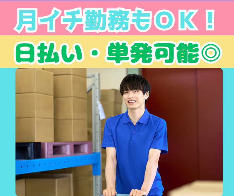 仕事内容 \ Wワーカーさん多数活躍中! / ☆+..+☆+..+☆+..+☆+..+☆+..+☆ *シフト自由がうれしい! *勤務翌日に給与GET!日払いOK(σ・ω・)σ *週1日~、月1日~の「超」自由シフト♪ *お菓子に囲まれコツコツ単純作業♪ *髪色・ネイル・ピアス自由! *香里園から無料送迎ありで楽々◎ ☆+..+☆+..+☆+..+☆+..+☆+..+☆ 【仕事内容】 お菓子の物流センターで、ピッキング、検品、仕分けなどの軽作業♪ 扱うのは身近な「お菓子」なので重たいものは少なめです! 勤務地:京都府乙訓郡大山崎町 ~具体的には~ *リストを見て商品を集める(ピッキング) *商品の数や種類のチェック(検品) *配送先ごとの仕分け・箱詰め など ◎まずは業務の流れなどイチから丁寧にお教えします♪ 「急な出費が…」という時も安心!稼働分の給与を翌日に受け取れる日払い制度があります(週払いもOK!) ★月1回だけでもOK!自由シフト♪  ̄ ̄ ̄ ̄ ̄ ̄ ̄ ̄ ̄ ̄ ̄ ̄ ̄ ̄ ̄ ̄ ̄ 「テスト期間は休み」「今月は旅行に行くから週0日」など、自分の都合に合わせて働けます。 週1日はもちろん、「1ヶ月に1日だけ」という登録制のような働き方も大歓迎!学生さんのWワークや、扶養内勤務希望の方も無理なく続けられます。 ★通勤ラクラク!  ̄ ̄ ̄ ̄ ̄ ̄ ̄ ̄ ̄ ̄ ̄ ̄ ̄ ̄ 「香里園(事務所)」から無料送迎バスが出ています!もちろん、バイクでの直行直帰もOK! 地元の方はもちろん、少し離れたエリアからも通いやすい職場です♪ 服装・髪型・ネイル(つけ爪NG)も自由なので、オシャレを我慢せずに働けます◎