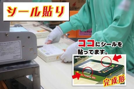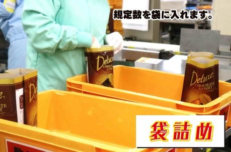 仕事内容 ブラックサンダーを製造している工場で、個包装になった商品を箱詰めや袋詰め、シール貼り等をお願いします。 ★お仕事内容★ 「イナズマ級のおいしさ!」でおなじみのブラックサンダーを作っている会社です。 ココアクッキーとビスケットのザクザク食感が人気の、ロングセラー商品を作っています。 冬はチョコレートの需要が高くなる時期!気温が下がり、ブラックサンダーも冬季限定商品発売中! 製造数も増えるため、年末に向けて増員募集を行います。 ★お仕事内容★実際の写真を掲載中★ 一つ一つ個包装になった、手のひらサイズのブラックサンダーを取扱います。 ≪箱詰め≫ ラインに個包装になったブラックサンダーが流れてくるので、化粧箱に規定数入れます。 数人がラインに並んで箱詰めを行います。 ※取りこぼしても他のスタッフさんがフォローしてくれるので、焦らず箱詰めしてくださいね。 ≪袋詰め≫ 規定数、袋に詰めます。 ブラックサンダーラインは座って袋詰めを行います。 ≪シール貼り≫ ブラックサンダーを詰め終わった箱に、フタを抑えるためのシールを貼ります。 ラインもゆっくり流れるので、焦らず丁寧にシールを貼ってくださいね。 ≪梱包≫ 出来上がった商品を発送用の段ボールに詰めます。 詰め終えたらフタを閉じて規程の位置に置きます。 上記の作業のローテーションです。 工場内には4つのラインがあり、前日の15時には事務所に翌日の担当ラインが貼り出されているので、退勤時に確認ができますよ。 手のひらサイズで軽いチョコレートを取扱うので体に負担もかかりにくいですよ♪ ★未経験の方も安心★ 先輩社員がお仕事について相談に乗ってくれたり、一緒に作業を行ったりしてくれるトレーナー制度というものがあります。 入社したてで、不安なことやわからないことがあってもすぐに相談できる環境が整っています。すぐに不安を解消できるので、スキルが向上していきますよ♪ 部署によっては座り仕事もあります♪ スタッフさんの体に負担がかからないよう、工夫された機械を導入しています。 困ったことをすぐ相談ができる環境や、スタッフさん第一に考えられた工夫がされていることから長期で働きたい方にとってもオススメの職場です。