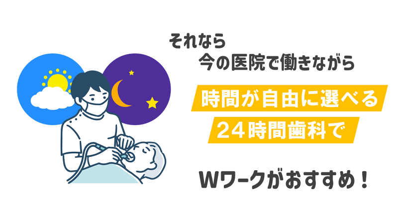 アピールポイント: 【当院で働くメリット】 「働ける時間帯を選び、自分に合った働き方を」これが今の時代の働き方 「子供がいるので時短で…」「勤務医掛け持ちでプラスのお給料を…」など、多くの働き方が可能です。 診療時間が他の歯科医院と比較して長いため、融通の利くライフスタイルに合わせたシフトが可能。 【当院の特徴】 当院は24時間診療の空港口歯科医院グループです。 患者様のニーズを第一に考え、既成概念にとらわれることなく患者様の視点に立ち、どの時間でもお迎えできるようにしています。 2019年リニューアルオープンし、新しく綺麗な職場。月火水金は21時まで診療。 【働き方の一例】 * Wワーク初挑戦ドクター 常勤先の定休日に、週1勤務~可能。異なる職場で働くことで、新たな成長に繋がります。ご自身で医院を経営している方も働かれています。ご都合をご相談の上、頻度も決めてください。《おすすめのポイント》 ◆20名以上もの歯科医師の先生が開業に成功!独立開業に最適な環境 歯科医院の開業をいつしようか…と悩んでいる先生方へ 開業をする際に最も重要なのは言うまでもなく「ご自身の歯科医師としてのスキル」です。 つまり、「何年働いてきたかではなく、どれだけの症例を見てきたか」です。 24時間グループでは、診療時間が通常の歯科医院よりも長く、難症例への対応ができるようになることはもちろん、 開業で必ず必要になるユニットなどの機械設備を格安で購入することができます。当グループでは、あなたらしく前向きに活躍できる環境を用意してお待ちしております。 ご興味のある方はお早めにご応募ください。