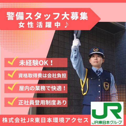 JR池袋駅/ルミネ池袋/JR関連施設での警備スタッフ/施設の安心・安全を守るヤリガイある仕事! 契約社員 ―館内の警備がメインなので、快適な環境でのお仕事! 館内の警備がメインなので、快適な環境でお仕事ができます。ずっと立ちっぱなしという業務は基本的に無く、座っての受付業務や館内巡回や、館の開店・閉店業務が主なので体力的にも安心です! -JR東日本グループの一員! 充実した福利厚生制度が揃っているのも自慢です! ―資格取得の事前バックアップあり 資格取得にかかる費用はもちろん、 教育面のバックアップもしっかりと行います。 ―現場での日々の頑張りはしっかり評価 社員同士がお互いのいいところを褒めあう【ハッピーポイント制度】を導入! 職場の雰囲気も“◎”。