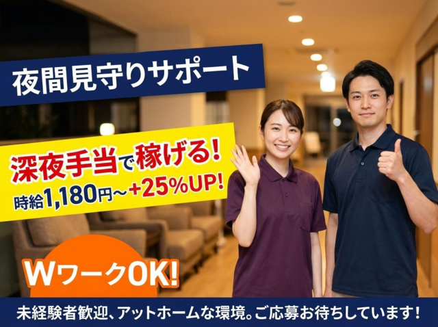 仕事内容 ━━━━━━━━━━━━━━━━━━━━ \\注目ポイント// 【週2日~OK!】本業との両立しやすい 【深夜割増あり!】22時〜5時は時給25%UP 【Wワーク歓迎!】+αの収入にできます ━━━━━━━━━━━━━━━━━━━━ ◇◆ 特別養護老人ホーム明星について ◆◇ 特別養護老人ホーム明星では、 「すべての人と共に健康で生きがいのある 安心した暮らしを」をモットーに サービスを提供しています! 利用者様が、自然豊かな町で老後の 生活を送り、毎日を喜びや安心で 満せるようなケアを目指しています♪ ━━━━━━━━━━━━━━━━━━━━ 【業務内容】 特別養護老人ホームでの夜勤補助スタッフ ・夜勤者の業務補助 ・排泄介助(オムツ交換) ・その他の生活介護・援助 ※指示・判断は夜勤者が行います ※入力作業なし! ━━━━━━━━━━━━━━━━━━━━ 見学やお話聞くだけでもOK♪ お気軽にお問い合わせください! 皆様のお問い合わせやご応募お待ちしております! TEL:072-891-2029(徳山宛) ━━━━━━━━━━━━━━━━━━━━