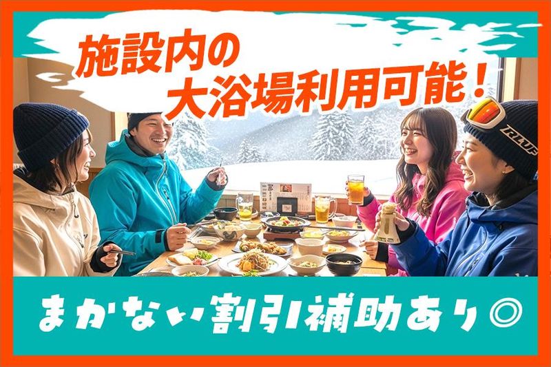 職場環境 <寮について> ・部屋タイプ:相部屋(徒歩10分) ・まかない :朝、昼、夜の3食あり(有料) ・部屋設備 :TV、冷暖房、冷蔵庫、(共有)トイレ、洗濯機、電子レンジ、Wi-Fi ・特典 :スキーレンタル用品(ウエアやボード)無料 喫煙所:なし(敷地内全て禁煙)