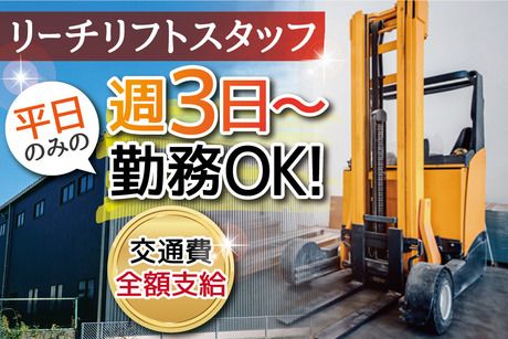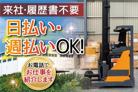 仕事内容 ●リーチリフトでの商品の格納・運搬作業 物流倉庫内でリフト作業をお願いします! 扱う商品は着物の生地の反物◎ <具体的には…> ・リーチリフトでの格納、運搬作業 ・たまに手作業での移動もあり リフト作業がメインです! 難しい業務はないので リフト免許があれば実務未経験でもOK! ●免許を活かして働く♪20代~50代の男性活躍中! 「せっかく免許とったけれど仕事経験がない」 「倉庫内作業は久しぶり」 そんな方もみんな大歓迎♪ 反物の運搬はリフトでの作業がほとんどですが 何本かのみ移動する際は手作業もあります。 1つ当たりの重さは10~20Kg程度。 免許を活かしたい、体を動かしたい、 そんな20~50代の男性が多数活躍中です! ●週3日から週5日のレギュラー勤務まで♪希望に合わせて働ける! 土日祝休みで夜勤は一切ありません。 週3日から私生活に合わせて働けます♪ しっかり稼ぎたい方は週5日のレギュラー勤務も大歓迎! 希望収入額にそった働き方相談もOKです。 平日の日勤だけなので、家族や友人と予定を合わせたり 自分の趣味を楽しむ時間も確保できます◎ 無理なく長く続けられるお仕事です! ◆来社&履歴書不要!電話でお仕事のご紹介が可能です。 今回募集しているお仕事に関して もっと詳しく説明してほしいと思われた方には、お電話でしっかり説明します。 来社&履歴書不要でお仕事のご案内が可能なので 仕事が休みの日や仕事終わりなど、 あなたの都合のよいタイミングで連絡いただければ希望のお仕事を案内しますので まずはご応募ください。