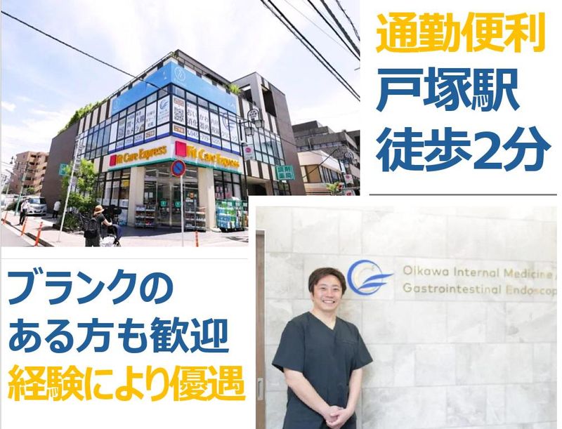 仕事内容 【OPENしたて快適環境】実質週4日勤務・予約制で残業が殆どないため、子育て・家事と両立したい方にもピッタリな職場です。 胃・大腸の内視鏡検査で働き盛りをサポートするクリニック。研修は基本知識から1~2ヶ月丁寧に行うため初心者も安心して始められます。 ╲この求人のPOINT/ ◎戸塚駅から2分!通勤便利 ◎勤務は実質週4日! ┖完全週休2日+週2回半日休み ◎内視鏡検査が初めての方も歓迎 ┖未経験入社の方が活躍中です ◎予約制で時間通りに診療 家事・子育てと無理なく両立可能 *************** ✅主な仕事内容 ◎外来診療の補助、採血など ◎内視鏡検査のアシスタント・介助 および付随する業務 ◎検査の流れなど患者さんへの説明 ✨内視鏡検査の研修について 1~2ヶ月かけて、必要な知識から 丁寧にお教えしますのでご安心下さい。 ✨検査は午前・午後各6名程度 スケジュールと業務が明確なため スムーズに進められます。 看護師は現在3名。アシスタントの 看護助手も揃っておりフォローは万全! ――――――――――――――――― ✅痛みのない短時間検査 患者さんが心配する検査時の痛みがなく、 通勤のついでに受けられるほど短時間。 ”内視鏡検査を気軽に活用して貰いたい” 想いを込めて開院したクリニックです。 ✅自分の時間を大事に! 院長自身も「仕事はメリハリ良く」が信条。 良い医療サービスのためにも 休養がしっかり取れる条件です。 完全週休2日(火・日)のほかに 金・土は半日休み⇒実質週4日勤務! 月曜に祝日があれば日~火曜まで3連休♪ ✅スタッフに配慮した院内 働く人が快適であるように、 クリニックの設計段階から工夫しました。 例えば、スタッフ専用のトイレや ゆっくり寛げるスタッフルーム、 ロッカーは個人専用を完備しています。 ✅院長より 健康志向が高まる一方「健診のために会社は 休めない」という方が多いのが実情です。 そこで「働く人を応援しよう」と思い立ち 気軽に検査ができるクリニックを創りました。 共感して頂ける方!働きやすさには特に 力を入れていますのでご一緒に働きませんか。