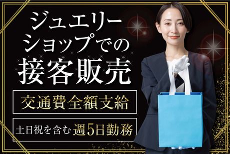 仕事内容 ■上質な素材を使用したファインジュエリーを取り扱っています <<ジュエリー販売経験者の募集>> 20代~60代までの幅広い顧客層に 愛されているジュエリーショップでの接客販売のお仕事です。 ノルマではないですが、店舗目標・個人目標があります。 積極的に声かけできる方は大歓迎! ●接客販売・会員登録 ●商品ディスプレイ ●品出し ●在庫管理 ●お会計、ラッピング、カタログ送付 ●売上入力 売上入力は、簡単なエクセル操作ができればOK◎ ■ジュエリー好き歓迎♪店舗貸し出しのピアスでオシャレも! お店のイメージを崩さないために 髪色やネイルには規定がありますが、 ヘアカラーは10番までOKなので、 わりと明るくても大丈夫です! 規定範囲内でのオシャレを楽しめます♪ また、ジュエリー好きは必見! ピアスは店舗から貸し出しあり! お店のジュエリーを着けてお仕事可能です◎ ■高時給×週5日で安定収入が叶う♪ジュエリー販売の経験者歓迎! 高時給のフルタイムで、月収26万円以上も可能! 初月は特別時給1800円の期間もあるので、もう少しUP! 20代~40代の男女スタッフが活躍中の職場です♪ ジュエリー販売の経験を活かして働けます! お客さまへのお声がけなど、 自分から積極的に動くことが出来る方にピッタリです◎ ■来社&履歴書不要!電話でお仕事のご紹介が可能です。 今回募集しているお仕事に関して もっと詳しく説明してほしいと思われた方には、お電話でしっかり説明します。 来社&履歴書不要でお仕事のご案内が可能なので 仕事が休みの日や仕事終わりなど、 あなたの都合のよいタイミングで連絡いただければ希望のお仕事を案内しますので まずはご応募ください。