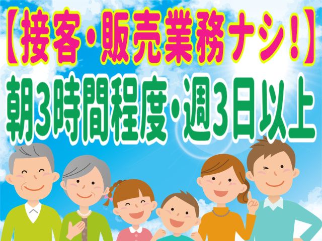 勤務時間 5:00~3時間程度(終了時間変動の場合あり) 勤務/火~日(火木土含む週3日以上、長期勤務可能な方優遇!) ※月曜日はお休みとなります。