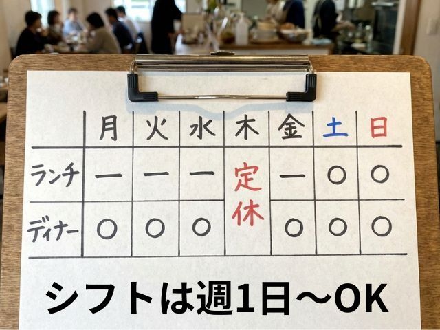 勤務時間 【ランチタイム】 10:00~15:00 【ディナータイム】 18:00~22:00 時間帯相談OK! 【選べる時間・曜日!シフト自由◎】 *平日のみOK! *土日祝のみOK! *学校帰りの夜だけOK! *テスト期間は週0日も相談OK! *扶養内勤務OK! あなたの予定に合わせて働けます