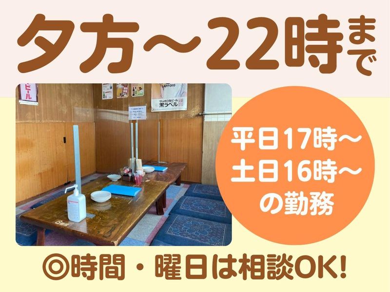 勤務時間詳細 ■平日・土曜/17:00~22:00 (ラストオーダーは21:15) ■日・祝/16:00~21:00 (ラストオーダーは20:00) ◎週3日~・1日3h~OK! ◎土曜日に勤務できる方大歓迎! ◎シフトは2週間ごとの希望制です。 ◎学校の予定や旅行の予定など、 連休にも対応いたします。 「テスト期間は丸々お休み」、 「学校帰りの夕方から」、 「平日のみ」、「土日中心」、 「短時間」等もOK! 学校やサークルを優先しながら 自分のペースで働けます! 急なお休みの希望もスタッフ同士 助け合いながらシフトを調整しています。