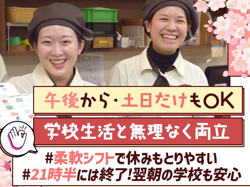 アピールポイント: ┏━━━━━━━━┓ ココが選ばれるPOINT ┗━━━━━━━━┛ ✅シフトの自由度がとにかく高い! 「今週はテストだから少なめ」 「長期休みはガッツリ稼ぐ」など、 2週間ごとのシフト制で調整がラクラク。 変則勤務もOK! 朝9時に出勤して13時に退勤 ↓ 一度帰宅して夕方17時から21時まで再出勤! なんて中抜きシフトも相談可能です。 ✅午後・夕方から勤務できる方も大歓迎! 授業終わりの17時や18時スタートもOK! 年間を通してアルバイトスタッフは 22時(早ければ21時半)には完全退勤なので、 翌日の1 限も安心です。 ✅未経験・バイトデビューを全力応援! ┗マニュアル完備: 覚えることは決まっているから安心◎ ┗お友達紹介特典あり: 実働50時間勤務で 双方に5,000円プレゼント! 仲間と一緒に頑張れます。 ✅頑張るあなたを“食” でもサポート! 休憩中には、お店から「おやつ・食事」の提供あり! さらに、超繁忙期のクリスマス期間は 出勤スタッフ全員に豪華なお弁当を用意&時給もUP☆ 空腹知らずで楽しく乗り切れます!