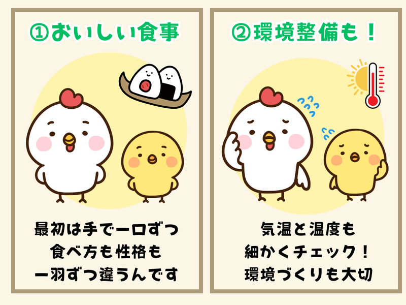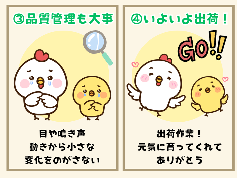 仕事内容 \豊橋・多米町に新農場オープン予定!/ ✅新農場について 現在、豊橋市多米町にて 新農場の立ち上げを予定(2026年4月)しています。 入社後はまず 【東上農場(豊川市東上町)】 または 【白井農場(豊橋市船渡町)】 で勤務いただき、 基礎スキルをしっかり身につけていただきます。 その後、 ・個人の習熟度 ・多米町農場の生産体制 などを踏まえ、 1年を目安に新農場へ異動予定です。 (※時期は変動する可能性があります) =================== 「何かを始めたい」 ――そう思ったあなたへ。 今の自分をちょっと変えてみたい。 都会の暮らしに疲れた。 動物と関わる仕事がしてみたい。 理由はなんだっていいんです。 ここには、命と向き合う仕事があります。 最初はわからないことだらけ。 にわとりの繊細さに驚くかもしれません。 でも毎日を重ねるうちに、 あなたの中に“育てる力”が育っていきます。 小さな一歩が、大きなやりがいにつながる そんな仕事、はじめてみませんか? ✅新農場について 現在、豊橋市多米町にて 新農場の立ち上げを予定(2026年4月)しています。 入社後はまず 【東上農場(豊川市東上町)】 または 【白井農場(豊橋市船渡町)】で勤務いただき、 基礎スキルをしっかり身につけていただきます。 その後、 ・個人の習熟度 ・多米町農場の生産体制 などを踏まえ、 1年を目安に新農場へ異動予定です。 (※時期は変動する可能性があります) =================== ✅仕事内容 エサ・水やり ▶最初は手で与え、 成長に合わせて自動に切り替えます。 でも、自動になっても チェックは欠かせません。 性格も食べ方も一羽ずつ違うんです。 鶏舎の温度管理 ▶気温や湿度に応じて毎日調整。 まさに“命の空間づくり”です。 設備点検・清掃 ▶電球や給餌機の不具合チェック、 ひよこを迎える前には徹底清掃。 水洗い・消毒・乾燥でピカピカにします。 品質管理 ▶「ちょっと元気がないな」 と感じたらすぐにケア。 目や動き、鳴き声から 小さな変化に気づくことが大切です。 出荷作業 ▶育てた鶏が無事に大きくなったら、 いよいよ出荷。 一羽一羽を大切に運び出し、 送り出す大事な瞬間です。 など =================== 飼育は会社の中では とっても重要な役割なんです。 私たちは、鶏を育てて出荷し、 商品としてお客様に届けるところまでが仕事。 にわとりが健康に育たなければ、 何も始まらないんです。 それだけに、責任は重大。 でも、それ以上にやりがいのある仕事なんですよ。 にわとりって、実は とっても繊細な生き物なんです。 大きな音に驚くだけでも、 命を落としてしまうことがあります。 性格もさまざまで、 のんびり屋さんもいれば、 ちょっとビビりな子もいます。 だからこそ、毎日しっかりと観察し、 一羽一羽を丁寧に育てる必要があります。 1棟まかされるようになると、 何千羽もの命を預かることに。 でも、それがやりがいになるんです。 親心がくすぐられる仕事。 大変だからこそ、面白い。 「生き物を育てるって、こういうことなんだな」 と実感できます。 - ✅現場のリアル(でも、そこが好き) 正直、楽な仕事ではありません。 夏は暑く、冬は寒い。 においもあるし、ほこりも舞う。 だから、仕事帰りにデート …はちょっと厳しい(笑) 一度お風呂に入ってからでないと無理ですね。 命と向き合うことでしか味わえない、 達成感と感動があります。 たくさんの小さな命が、 あなたの手を通して育ち、旅立っていく。 それは、誰にでもできる仕事ではありません。