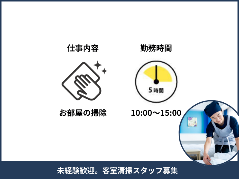 職場環境 2024年にオープンしたばかりのきれいなホテルでの勤務。 接客ナシ!だから清掃作業に集中できます! 先輩スタッフも未経験START! サポートや作業のコツなどをお伝えします! 慣れれば基本作業は1人で。 20代~50代の幅広い年齢層の方が活躍中! 喫煙所:喫煙所あり(屋外)