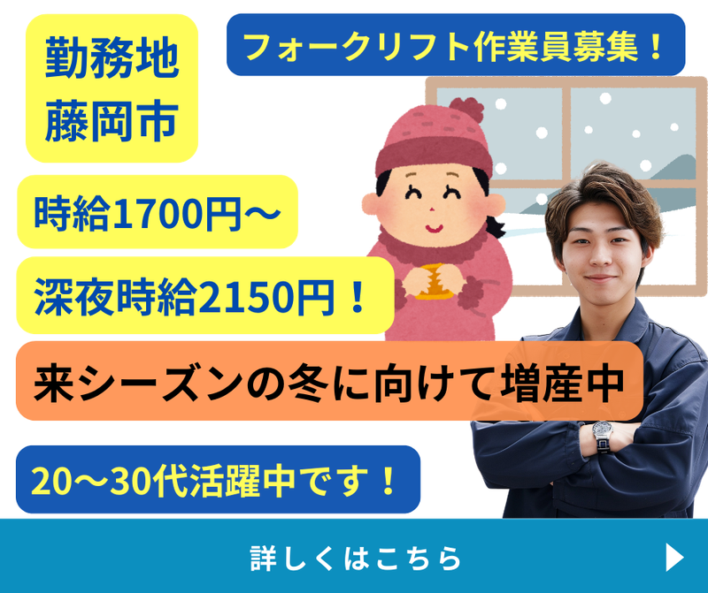 仕事内容 == 交替制で稼げるお仕事! == 冬場に大活躍♪♪【カイロ】の製造staff 現在も次の冬に向けて。。 たくさん在庫を作っています! 20~30代のスタッフ活躍中! 「温もり」を届けるお仕事しませんか? =================== カイロを製造する大手企業でのお仕事! 【おススメPOINT】  ̄ ̄ ̄ ̄ ̄ ̄ ̄ ̄ ̄ ̄ ̄ ̄ *未経験も大歓迎!人気のモクモク作業 *大手企業で長期安心! *土日休みでプライベート充実 *2交替制でガッツリ稼げる (22時以降:時給2150円!!) 【仕事内容】  ̄ ̄ ̄ ̄ ̄ ̄ フォークリフト作業 *完成したカイロの運搬 *主にリーチフォークを使用 (要フォークリフト免許) をお願いします! モクモク作業が好きな方必見のお仕事** 〇20代~30代が活躍中の職場です