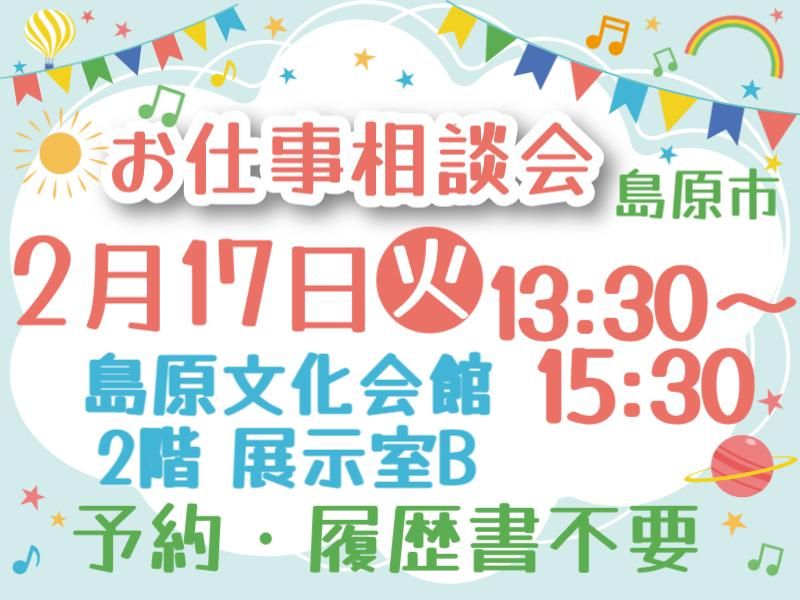 選考プロセス WEB・電話応募どちらも可!WEB面接OK ☎0120-68-2209 ■応募⇒面接⇒採用 ※応募~最短3日間で入社可! ※応募に相談会の参加は必要なし 【お仕事相談会】 ※予約&履歴書不要!服装自由! ※希望者のみ事前説明いたします *2/13(金)13:30~15:30 【大村市】サンスパおおむら商業棟2F 会議室A *2/17(火)13:30~15:30 【島原市】島原文化会館 2F 展示室B *2/27(金)13:30~15:30 【佐世保市】佐世保市労働福祉センター 3F 小会議室A *3/4(水)13:30~15:30 【長崎市】メルカつきまち5F A1会議室 ―――――――――――――――――― 「日程が合わない…」という方もOK! 長崎事業所(諌早市栄田町)で随時、 お仕事のご紹介が可能です! まずは、お気軽にご相談ください! ――――――――――――――――――