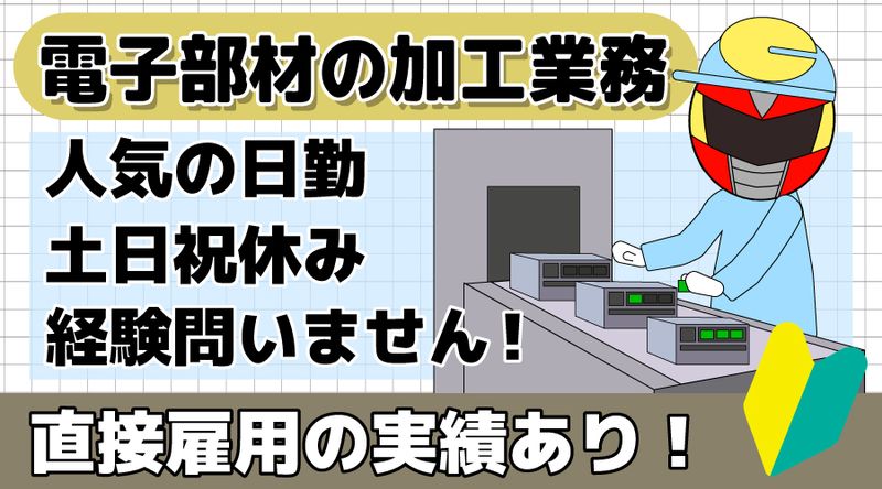 仕事の内容 【未経験OK!電子部材の加工スタッフ募集】 \ 上場企業で安定勤務! 長く働きたい方におすすめ♪/ ≪お仕事内容≫ 機械に電子部材をセットし、切断・切削・研磨などの加工を行います! ・ 一部、手作業で部材をセットする工程あり ・ 加工の途中で寸法測定や目視検査を実施(マイクロメーター使用) ♥ 未経験でも安心! 研修&フォロー体制が整っています♥ ≪おすすめポイント≫ ☆ 働きやすい環境☆ ・ 日勤のみ! 夜勤なしで生活リズム安定 ・ 長期休暇あり! GW・夏季・年末年始にしっかり休める ☆ 安定した職場☆ ・ 上場企業で安心勤務! 長く働ける環境 ・ 直接雇用のチャンスあり! 頑張り次第でキャリアアップ可能 ☆ 通勤&職場環境も充実☆ ・ 無料駐車場完備! マイカー通勤OK ・ 食堂スペースあり! 休憩時間も快適 ・ 制服や安全靴は貸与! ・ 受動喫煙対策あり(屋内禁煙) ☆ 職場環境☆ ・ 男女比 5:5! バランスの取れた職場 ・ 20代~40代が活躍中! 若手も多数在籍! まずはお気軽にご応募ください! ★本求人にご興味をお持ちの方は、応募する!より必須項目記載の上、 お問合せ下さい。 (お電話でのお問合わせ先:0120-67-3244 ※平日9時00分~18時00分)