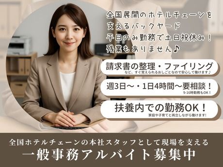 仕事内容 \一般事務パートさん募集!扶養内勤務OK◎快適オフィスワーク/ \このお仕事のアピールポイント/ ●平日のみ勤務で土日祝休み!残業もありません♪ ● 週3日~、1日4時間~要相談!9-16時勤務もOK! 働き方もフレキシブルに対応します ● 扶養内での勤務OK!家庭や子育てと両立しながら働けます ● ブランク明けOK! 分からないことも聞きやすい環境です ● 服装自由&きれいなオフィス! 快適な環境で働けます ● 経理の基礎を学べる! スキルアップも目指せます 【具体的な仕事内容】 まずは ●電話・メール対応 ● 請求書の整理・ファイリング などの出来るところからお任せします。 その他 ● データ入力(仕訳入力など) ● 経費精算や簡単なチェック業務 ● その他、経理スタッフの補助業務 などをお願いします。 ※会計ソフトの入力やExcel作業など、 事務経験がある方はスキルを活かせます ※未経験の方でも、丁寧にレクチャーしますので ご安心ください 全国に展開するホテルチェーン 「ホテルエリアワングループ」を ご存知でしょうか? 弊社はホテルエリアワングループとして全国にビジネスホテルを 多く展開するビジネスホテルチェーンです! その「ホテルエリアワングループ」の大阪本社にて、 現在、一般事務スタッフ(アルバイト)を募集しています! 主に、データ入力や書類整理などのサポート業務が中心で、 未経験の方でも安心してスタートできます。 働きやすい職場環境で、プライベートとの両立も可能です! <勤務地は堺筋本町駅・松屋町駅から徒歩8分> 静かで落ち着いたオフィス街に位置する 大阪本社での勤務です。 通勤に便利な好立地に加え、キレイで快適な オフィス環境で働けるのも魅力です。 落ち着いた雰囲気の中で集中して お仕事に取り組めます。 【こんな方におすすめ】 ● 以前は一般事務をしていたが、経理や総務に興味がある方 ● 経理や事務に興味があり、スキルを身につけたい方 ● プライベートと両立しながら働きたい方 ● 安定した企業で長期的に働きたい方 ● 女性が多く活躍している職場を希望する方 ● 育児中のママ/主婦・主夫/フリーター歓迎! 全国展開のホテルグループを支える大阪本社での勤務。 安定した事業基盤と整ったサポート体制の中で、 事務スキルを身につけられるチャンスです。 経理未経験から始めたスタッフも多数活躍中! ▼会社情報はこちら(公式サイト) https://xn-cckl2rvau.com/ 風通しの良い職場で安心スタート!人事・労務のサポートアルバイト募集 チーム内の情報共有がしっかりと行われており、 風通しの良い働きやすい環境です。 困ったときは先輩スタッフが丁寧にフォローしてくれるので、 未経験の方やブランクのある方も安心してスタートできます。 まずは、勤怠修正や電話・メール対応などの 基本的なサポート業務からスタートし、 少しずつ業務を覚えていけるので、 無理なくステップアップ可能です。 【お任せする主なサポート業務】 ● 勤怠データの修正補助・入力サポート ● 電話・メール対応(メインは社内メール対応など) ● 入退社手続きの補助:必要書類の準備や確認などのサポート業務 ● 雇用契約書作成の補助:テンプレート入力や印刷・ファイリングなど ● 社会保険の手続き補助:申請書類の作成や整理など ● 給与計算補助:データチェックや入力作業のサポート ホテル業界のこと、全然知らないけど大丈夫? 未経験から始めたスタッフが多数活躍中! 業界未経験でも心配いりません! 丁寧な研修と先輩スタッフのサポート体制が しっかり整っているので、初めてのアルバイトでも 安心してスタートできます。 分からないことは一つひとつ丁寧に教える環境なので、 少しずつ業務に慣れていけるのがポイントです。 また、総務や人事の経験がある方も大歓迎! 「久しぶりのお仕事復帰で不安…」という 主婦・主夫さんや、育児中でお子さんが学校に行っている間に 働きたいというママさんも歓迎! もちろん、総務・人事の経験がある方は大歓迎! これまでの経験を活かしながら、 ムリなく働けます◎ 基本は土日休み&18時定時♪ プライベートも大切にできるアルバイトです! シフト制ではありますが、 基本的に土日がお休み&18時定時なので、 家族との時間や学校の予定など、 プライベートと両立しやすい環境です。 育児中の方も多数活躍中! ライフスタイルに合わせて無理なく働けるよう、 サポート体制も整っています◎ - \育児中のママさんの声♪/ 「子育てと両立できる働き方ができて、 とても助かっています。 子どもの急な体調不良や行事にも理解があり、 シフトの相談もしやすいので、 安心して続けられる職場です!」 (30代女性スタッフ)
