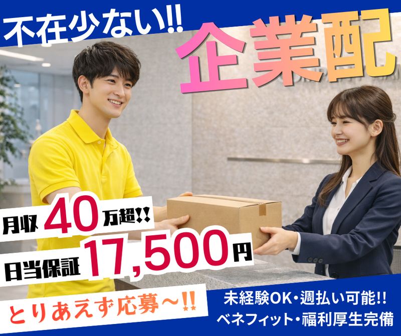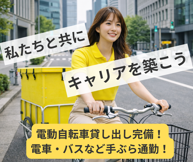 アピールポイント: ✅報酬保証+定時で終了! └早く終われば20時前に帰宅可能! ✅自転車ない方も!貸出します! └現地でお貸出しするので電車通勤! ✅全国で使える会員制ベネフィット └ほか誕生日プレゼントや福利厚生多数! ✅管理職などキャリアアップ可能! └安心の社内組織体制。未経験から昇進可能! ──────────────── ・積込から管理職がトレーニングします! ・大手法律事務所の弁護士と顧問契約! (契約書類や社内コンプライアンスも安心) ────────────────