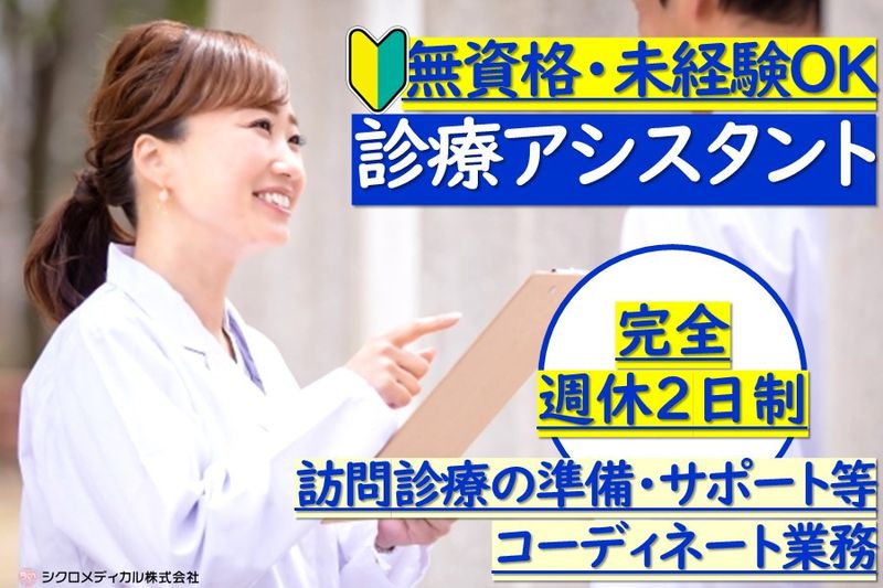 【仕事内容】 訪問診療の準備やサポートなどコーディネートを行う、診療アシスタントのスタッフ募集! 医師とチームを組み、患者様やご家族と診療所の橋渡し役としてニーズに寄り添い、安心して在宅療養生活を送って頂くためのサポートするお仕事です。 ドクター1人とアシスタント1名の2名で同行します。 ◎面接・ご入社時期について ・面接日のご希望ご相談に応じます。 ・ご入社時期ご相談に応じます。(早めのご入社も可能です。随時研修開始いたします。) ※内定が採用予定人数になり次第、募集を終了いたしますので、お早めにご応募ください。 ◎ポイント ・無資格・未経験OK! ・完全週休2日制!夏・冬長期休みあり! ・丁寧な研修(3ヶ月は同行によるOJTでの研修メイン) ◎コミュニケーションが活かせるお仕事 ・クラーク経験者の方特に歓迎! ・MR(医薬情報担当者)、MS(医薬品卸販売担当者)の経験者歓迎! ・接客・サービス業・営業などの経験者歓迎! ・医療ソーシャルワーカーや介護・相談員の経験者歓迎! ※新卒・第二新卒も歓迎です! ■詳しい仕事内容 当社がパートナー契約をしている在宅クリニック(みんなの在宅クリニック)での診療アシスタント業務 ●医師と患者様のもとに伺い診療をバックアップ(1日5~10件の施設訪問) 現地への車の送迎や、体温や血圧測定のサポートから医師がすぐに診察できるように使用する医療器具の準備等をお願いします。 診療中の会話内容を電子カルテに記録したり、診療レポートの作成をしたり、医師が診療に専念できるようサポートします。 医療知識や経験が無くても、しっかりと研修もあるので安心です。 ●患者様やご家族の相談対応 「症状が日々変化する中で、どうやって自分らしく過ごすか」を患者様やご家族と一緒に考え、意思決定を行います。 患者様やご家族は、ご自身の希望や不安をうまく言葉にできないことが多いです。 対話を重ねる中で患者様やご家族の本音を汲み取り、希望に沿った生活環境を整えるお手伝いをします。 ●チームで環境調整 患者様やご家族とお話した内容を元に、医師やケアマネジャー、介護施設などの管理者・看護師・ヘルパー、病院の医療連携室等、 いろいろな方と連絡や調整など、柔軟性のある対応と関係構築が大切です。他職種と連携・協力しながら、 患者様が最期を迎えるまでの時間を、自分らしく過ごせるようサポートします。 ※メールの送受信、インターネットの閲覧など基本的なPC作業あります。 ■管理職候補・幹部候補としての採用 将来は、クリニックの運営管理・事業企画や戦略を担う事務長や、マネジャー・管理職・法人の幹部候補としてキャリアアップが目指せます。 ■勤務先 【一般社団法人拠 みんなの在宅クリニック三河院】〒444-0802 愛知県岡崎市美合町西屋敷111-3 愛知県で初めての一般社団法人(非営利法人)運営による訪問診療を行う在宅クリニックです。 ■シクロメディカル株式会社について 訪問診療クリニックの開業を中心に訪問医療を地域で展開できるシステムを構築しています。 また、診療所向けに医療事務などのバックオフィス業務委託も請け負っています。 <事業内容> ・開業支援 ・運営支援 ・医療事務代行 ・夜間時間外対応 いきなりのご応募が不安な方は、まずはお問合せだけでもOKです! お気軽にご連絡くださいね。 ご応募・お電話お待ちしております。 【求人ID-SKR】