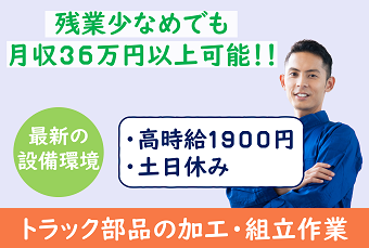 仕事内容 【長期★高時給1900円★最新設備】自動車部品の加工、ほぼ機械での加工なので計測や検査がメイン♪この季節にうれしい空調完備★工場見学で自分に合った作業ができる! <仕事内容> (1)加工:鉄板をトラックのシャーシの形状にする為に曲げ加工をします。 加工は機械がするので作業としては加工前の検査や測定、加工後の検査・測定の作業になります。 (2)塗装:機械にて塗装されるので、簡単な検査等の作業になります。 (3)ピッキング:加工された鉄の棒に組付ける為の部品のピッキングして、製品に置いていきます。 (4)組立:決められた箇所に決めれた部品を組付けていく作業です。 以上の工程を工場見学後に適性を見て配属、スキルや適性、資格によって配属可能先が増えていきます。配属後は覚えるまで専属の教育係がついて、きちんと教えていきます。 立ち作業|重量物を扱う(15㎏以上)|個人作業 《職場環境》 男性が多い職場|冷暖房完備 ●工場内の全体空調あり、大きな音もなく、新しい設備と環境になります。 ロッカー有り|休憩室完備 アピールポイント <仕事内容> (1)加工:鉄板をトラックのシャーシの形状にする為に曲げ加工をします。 加工は機械がするので作業としては加工前の検査や測定、加工後の検査・測定の作業になります。 (2)塗装:機械にて塗装されるので、簡単な検査等の作業になります。 (3)ピッキング:加工された鉄の棒に組付ける為の部品のピッキングして、製品に置いていきます。 (4)組立:決められた箇所に決めれた部品を組付けていく作業です。 以上の工程を工場見学後に適性を見て配属、スキルや適性、資格によって配属可能先が増えていきます。配属後は覚えるまで専属の教育係がついて、きちんと教えていきます。 立ち作業|重量物を扱う(15㎏以上)|個人作業 《職場環境》 男性が多い職場|冷暖房完備 ●工場内の全体空調あり、大きな音もなく、新しい設備と環境になります。 ロッカー有り|休憩室完備 \充実した福利厚生/ ◎社会保険・雇用保険完備 ◎有給休暇有(6ヶ月経過後、10日付与)※規定あり ◎残業手当 ◎交通費支給(規定内) ◎確定拠出年金制度 ◎週払い制度(週3回対応) ◎お友達推薦制度あり(規定有り) ※1名につき3万円~10万円臨時給与として支給 ◎車(マイカー)・バイク通勤可(無料駐車場あり) ◎制服貸与 ◎冷暖房完備 ◎食事持参可 ◎ロッカー・休憩室利用可 ◎福利厚生プログラム (宿泊、グルメ、ショッピングなど大幅割引が受けられる10万アイテムのメニューがあります。)
