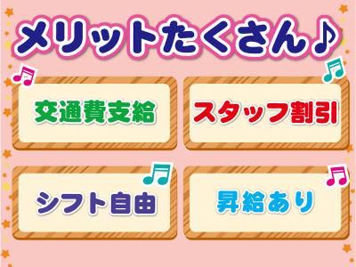待遇・福利厚生 【福利厚生】 ・交通費支給(月1万円迄) ・髪型髪色、ピアス、ネイル応相談 (規定有/業務に支障がない範囲) ・従業員割引き有り ・社員登用制度有