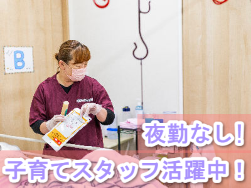 【アピールメッセージ】 \4月から給与UP!/ 家族との時間をしっかり取れる! 産休・育休の取得や復職を当たり前にできる環境* \一緒に相談しながら、働き続けやすい環境をつくっています/ ご家庭を大事にしながら長く勤務したい方、必見です!! 〈ここが働きやすい!〉 〇8:00から20:30の間でシフト制 …ライフスタイルに合わせて、ご希望をお伺いいたします。 夜勤なしでワーク・ライフ・バランスも取りやすい環境ですよ。 お子さんの送迎と両立しているスタッフもおります* 残業はほとんどありませんので、予定も立てやすいですよ。 〇育児休業・看護休暇・介護休暇の取得実績あり …ライフイベントやライフステージの変化があっても、無理なく長く働いていただけます。 ぜひ一緒に働きませんか?