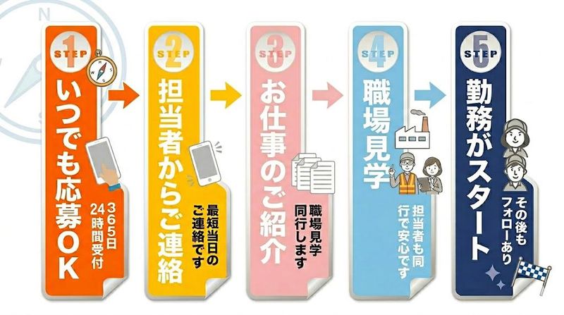 選考プロセス 応募から採用までは、 最短で1週間~2週間前後を予定しております。 スピーディな選考を心がけておりますので、 すぐにお仕事を始めたい方もご安心ください。 1. WEBからのご応募 【24時間受付中!】 まずは応募フォームからエントリーをお願いします。 応募内容を確認後、担当者より面談日程調整のため、改めてご連絡いたします。 2. 面談(リモート・電話相談もOK!) 形式的な面談ではなく、あなたのご希望をしっかりお伺いする場です。 不安なことがあればお気軽に相談してください! これまでのご経験や、お仕事に対するご要望など、ざっくばらんにお話ししましょう。 服装は私服でOKです。リラックスしてお越しください。 遠方の方や、お忙しい方は出張面談やオンラインでの面談も可能です。 3. 職場見学 **「どんな場所で働くのか」「自分にもできるのか」**といった不安を解消するために、応募先での職場見学を実施しています。 実際の作業風景や職場の雰囲気をご自身の目でご確認いただけます。 4. 内定・採用 入社日についても、あなたの状況に合わせて柔軟に対応いたします。 入社後のフォロー体制も万全です。 安心して新しい一歩を踏み出してください!
