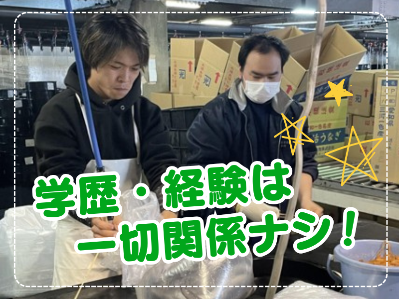 仕事内容 ✅週5日×1日8h~ フルタイムシフト♪ ✅WワークOK!20代代男性活躍中 ✅働きながら自然と筋トレにも♪ ¨¨¨¨¨¨¨¨¨¨¨¨¨¨¨¨¨¨¨¨¨¨¨¨¨¨¨¨ \まるで部活のような雰囲気♪/ 各チームに分かれて池から上がってきた うなぎを選別→仕分け→出荷までを行います。 < 具体的には… > ▼サイズごとに生きたうなぎを選別 ▼袋に酸素と氷を入れて計量 ▼うなぎを梱包・箱詰めして出荷準備 ≪⭐ココがポイント≫ ✅未経験スタートがほとんど ✅体を動かしてモクモク作業 ✅カンタン作業からステップアップ! 自然と体が鍛えられるので ジムいらずで細マッチョになれるかも♪ ¨¨¨¨¨¨¨¨¨¨¨¨¨¨¨¨¨¨¨¨¨¨¨¨¨¨¨¨ ≪⭐相談しやすい環境◎≫ 職場は20代30代などが中心に活躍中。 先輩スタッフもすぐ近くにいるので 分からないことはその場で質問OK。 ≪⭐そのまま正社員へも大歓迎!≫ 学歴や経験は不問! 未経験から始める方がほとんどです。 「いきなり正社員はちょっと…」 「高校卒業後はこのまま就職したい」 「そろそろ正社員で働こうかな」 などアルバイトから正社員になった方も沢山♪ ¨¨¨¨¨¨¨¨¨¨¨¨¨¨¨¨¨¨¨¨¨¨¨¨¨¨¨¨