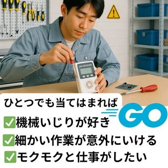 仕事内容 ■派遣スタッフ活躍中!大手メーカー勤務 【業務内容】 ガス検知器の修理・動作検査 部品の付け替えなどが中心ですので、専門知識不要! 製品のジャンル不問!これまでの作業経験を活かせます! 実務経験がない方は、ドライバーの使用に抵抗がなければOK! ゆっくり覚えていってください。 【ポイント】 ●近くに社員さんがいるので分からないことがあればすぐに聞ける環境なので安心です! ●勤務地付近にて出張面接対応しております!! ≪お気軽にお問い合わせ・ご応募くださいね≫ ■実務経験なくても大歓迎! ドライバーや工具の扱いに抵抗がない・・・ 機械いじりが好き・・・そんなあなたにをお待ちしています! さまざまな機械製品がありますが、ひとつひとつ着実に 覚えていけるのでご安心ください。 腰を据えて、スキルアップできるお仕事です◎ 長く続けられる方がほとんどです。定着率の高い人気職場です! プライベートとの両立も可能! ■この仕事の特徴 部品の付け替え、修理内容のPC入力など、デスクでのお仕事が中心です! 初めは先輩社員が丁寧にお教えしますが、 慣れればご自身のペースで働いていただけます。