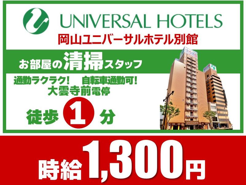 仕事内容 お急ぎの場合や WEB応募の苦手な方は お電話でのお問い合わせも歓迎! TEL 086-272-1955 採用担当(本社につながります) 受付:月~金(9~20時) 客室清掃スタッフとして、お部屋の清掃やベッドメイキング、タオルやシーツの交換などを行います。 お部屋の掃除:ベッドメイキング、掃除機をかける、ゴミを片付けるなどの清掃作業。 アメニティの補充:タオルやシーツ、アメニティグッズなどを交換・補充し、お部屋を快適に整えます。 レイアウトの整備:家具や備品の配置を整え、お部屋を清潔で心地よい空間にします。 掃除や整理整頓が得意で、細かい作業も丁寧に行える方にピッタリです! ※【こんなホテル(会社)です】 1980年2月の設立より40年以上にわたって堅実な経営を続け、リーズナブルな価格で上質なホテルサービスを提供してきた当社。現在は12棟3000室を超える規模でビジネスホテルチェーンを展開しています。 朝食と夕食の2食が無料。他には中々ないサービスをお客様に提供しています。常連のお客様も多くいらっしゃいます。 ※「ビジネス」「女子旅」「家族旅行」など性別・年代問わず幅広い層のお客様が宿泊されています◎